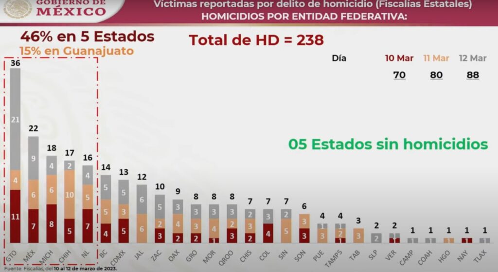 Apoyado con una gráfica, López Obrador mostró que Guanajuato se ubicó en el primer lugar de violencia el pasado fin de semana con 36 de los 238 homicidios dolosos cometidos a nivel nacional.
