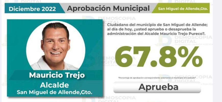 A lo largo de un año, el alcalde de San Miguel de Allende, Mauricio Trejo Pureco, se ha posicionado como el mejor evaluado de entre los ediles de los 46 municipios de la entidad, de acuerdo a reportes de la casa encuestadora con Demoscopia Digital, con calificaciones aprobatorias por arriba del 62%.