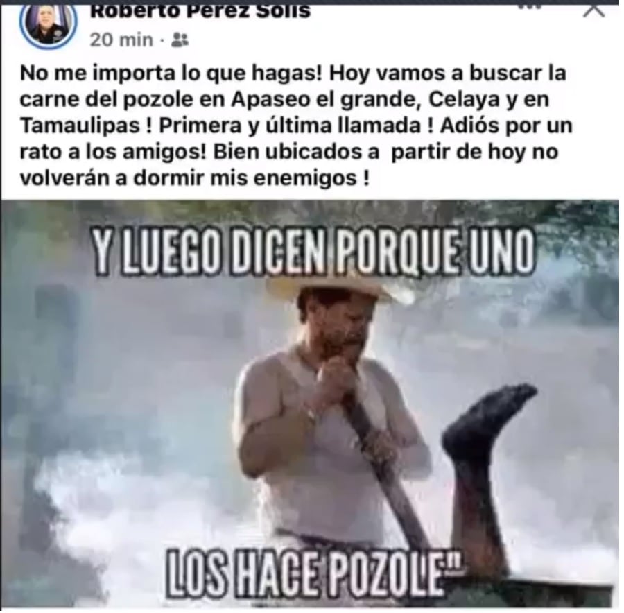 En redes sociales, Pérez Solís subió una imagen que hace alusión a un ‘pozolero’ criminal con la leyenda "Y luego dicen porque uno los hace pozole".