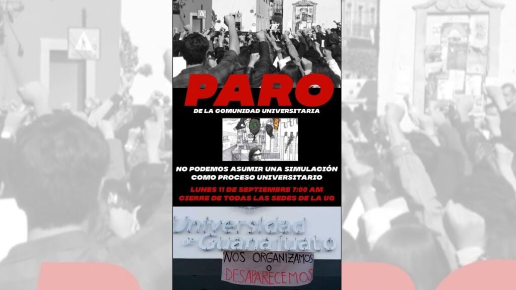 De acuerdo al mensaje difundido son diversas personas de la comunidad universitaria las que están dispuestas a organizar un paro de labores, por ello se invita a comunicarse a través de mensaje privado en el grupo de Democratización UG, para la organización del paro en las sedes de la Universidad de Guanajuato.