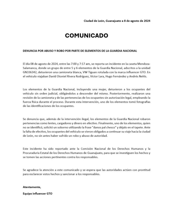 Fue este jueves 8 de agosto aproximadamente a las siete de la mañana en la caseta Mendoza – Salamanca, cuando un grupo de la Guardia Nacional detuvo al creador de contenidos Otoniel Rivera Rodríguez, y a sus acompañantes. De acuerdo con lo que narró Otoniel Rivera, los uniformados viajaban a bordo de la unidad GN336342 y los obligaron a descender para realizar una revisión del vehículo y de sus pertenencias. Uno de los elementos tomó fotografías de las identificaciones de cada uno de los tripulantes.En un boletín que difundió Otoniel Rivera, denunció que los elementos de la Guardia Nacional les robaron lentes, cargadores y dinero en efectivo. Incluso uno de los elementos les pidió dinero “pal chesco”.