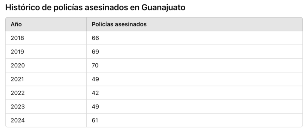 Guanajuato cierra el año liderando la lista de estados con más policías asesinados en el país, superando a entidades como el Estado de México, Guerrero, Chiapas, Nuevo León, Tamaulipas, Sinaloa y Michoacán, según el registro de la organización Causa en Común.