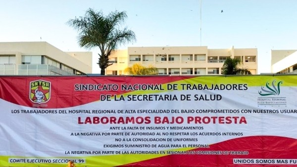 Desde el fin de semana, en la zona de rejas del Hospital Regional de Alta Especialidad del Bajío hay carteles de trabajadores sindicalizados exhibiendo la falta de recurso para surtir medicamentos, para dar buenas condiciones a los pacientes y para entregas de uniformes.