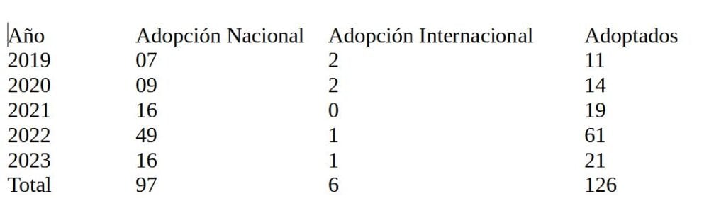 Las cifras del Sistema Nacional de Asistencia Social Pública y Privada señala que en todo el país hay apenas 67 menores, 6 niñas y 61 en el programa de asistencia familiar en residencias hasta el 2023.