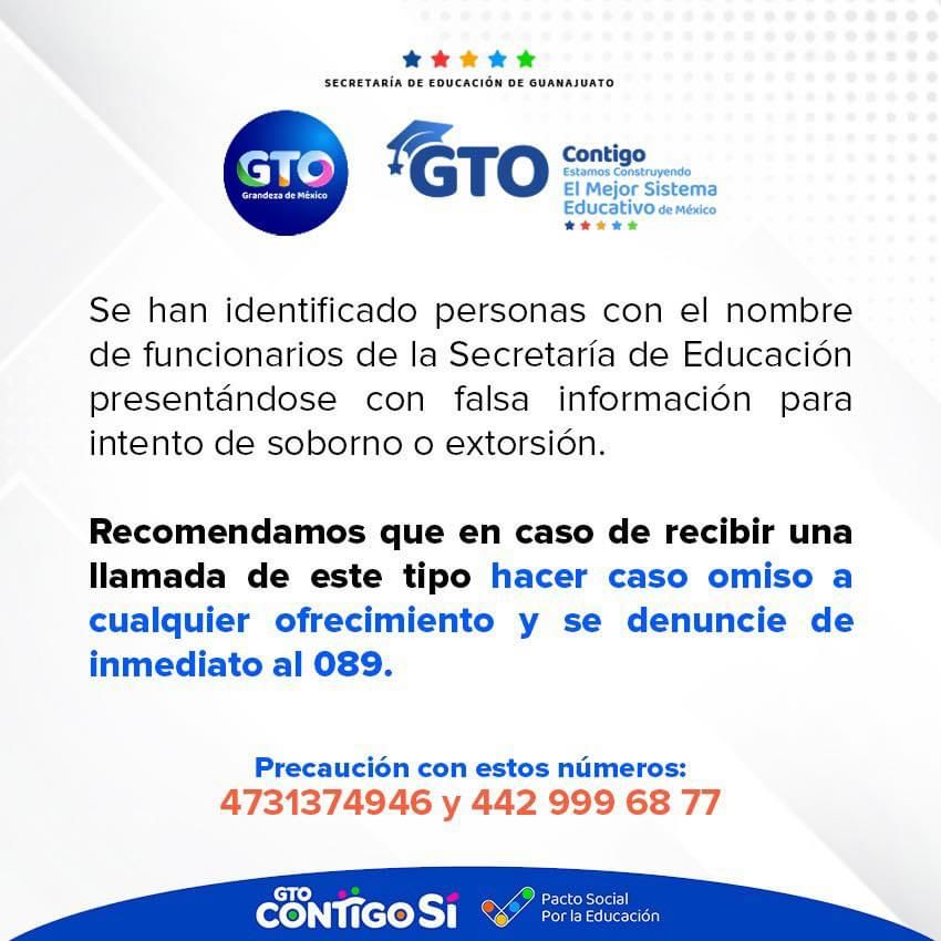 “Recomendamos que en caso de recibir una llamada de este tipo hacer caso omiso a cualquier ofrecimiento y se denuncie de inmediato al 089, precaución con estos números:4731374946 y 442 999 68 77”.