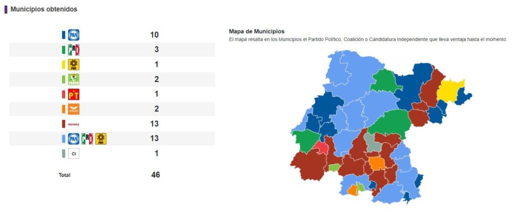 En tanto, Movimiento Ciudadano logra Cortazar y Moroleón. El PRI se queda con San Miguel de Allende, Manuel Doblado y San Diego de la Unión.