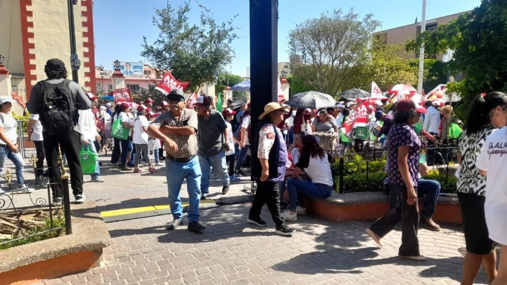 Los asistentes, quienes llegaron antes de las tres de la tarde, fueron provistos de gorras y sombrillas para soportar el sol que caía denso y seco sobre el Jardín Principal de San Pancho; los camiones que transportaron a los simpatizantes solo los acercaron a una cuadra del evento, y desde ahí tuvieron que caminar.