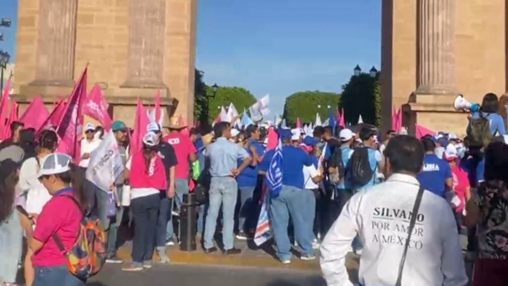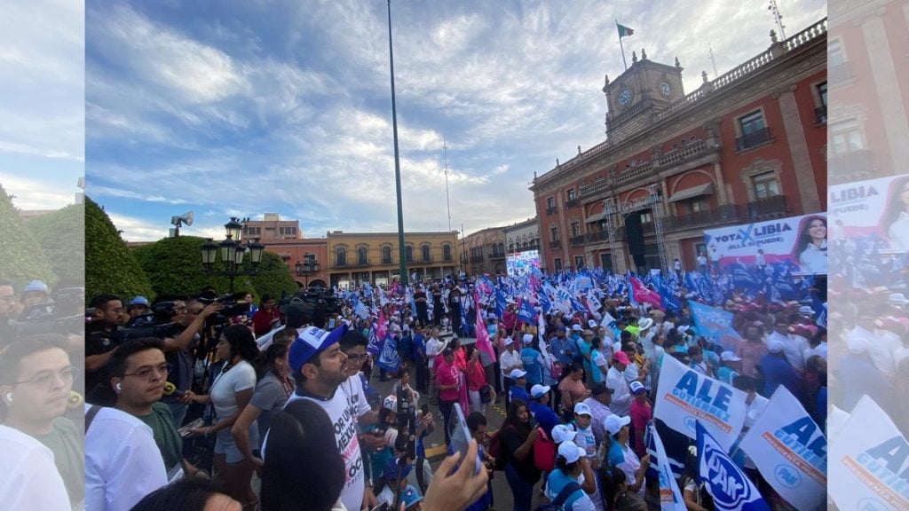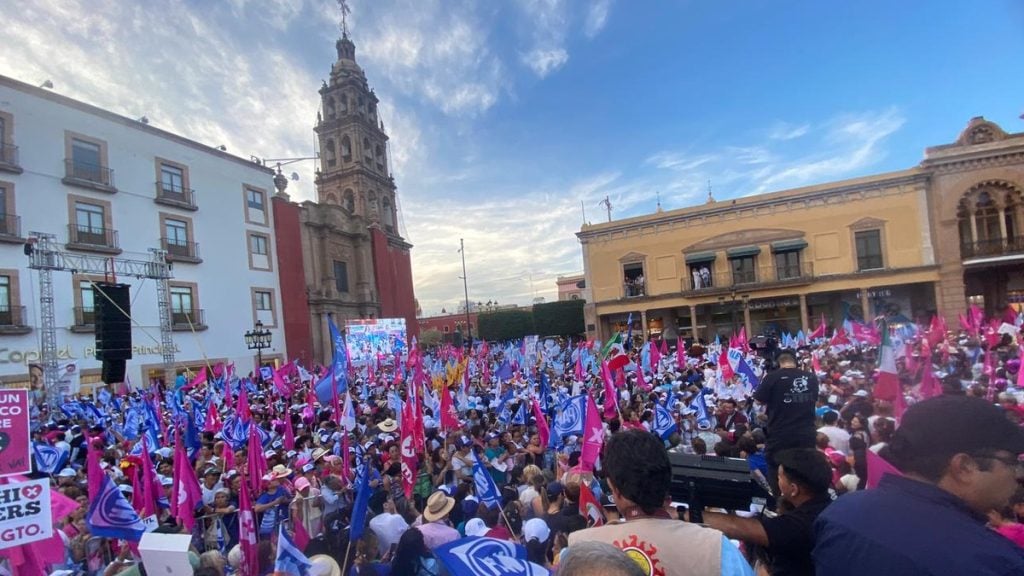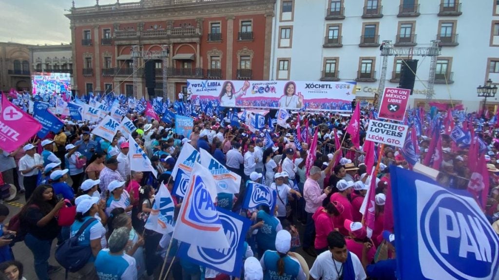 Antes, pequeños y grandes pasaron por la Madero gritando, tocando instrumentos y levantando carteles, y lonas, con mensajes de apoyo a Xóchitl.La llegada de la candidata presidencial, Xóchitl Gálvez, quien en todo momento estuvo acompañada de la aspirante a la gubernatura por el PAN, Libia Dennise Grcía Muñoz Ledo, ocasionó el entusiasmo de los seguidores. Desde el momento en que bajó de la camioneta, fue flanqueda por elementos de seguridad, quienes no lograban controlar a la multitud que se acercaba tratando de tomarse una foto con Xóchitl Gálvez, o pedirle un autógrafo.Al grito de ¡"Libia, Libia, Libia"!, y "¡Xóchitl, Xóchitl, Xóchitl!", decenas de personas recibieron a las candidatas en la plaza principal de León.En la plaza de León se dieron cita 12 mil personas