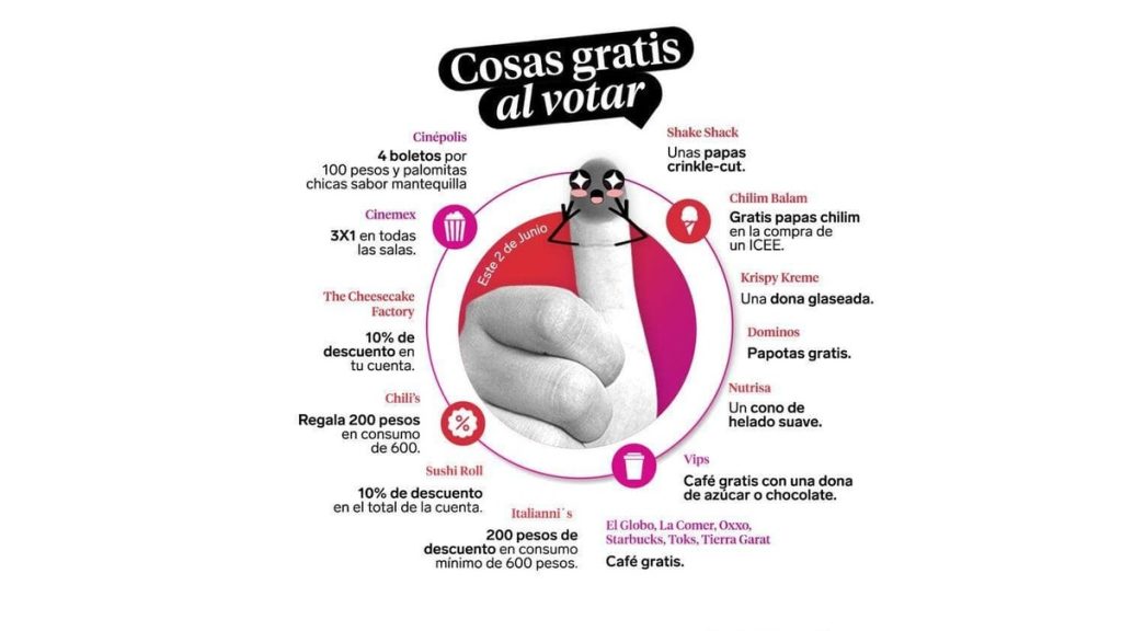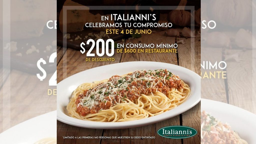 El restaurante Italianni’s dará un descuento de $200 pesos en el consumo mínimo de $600, en tanto que la tienda de donas Krispy Kreme, regalaría una dona glaseada original a los ciudadanos que comprueben que fueron a votar.