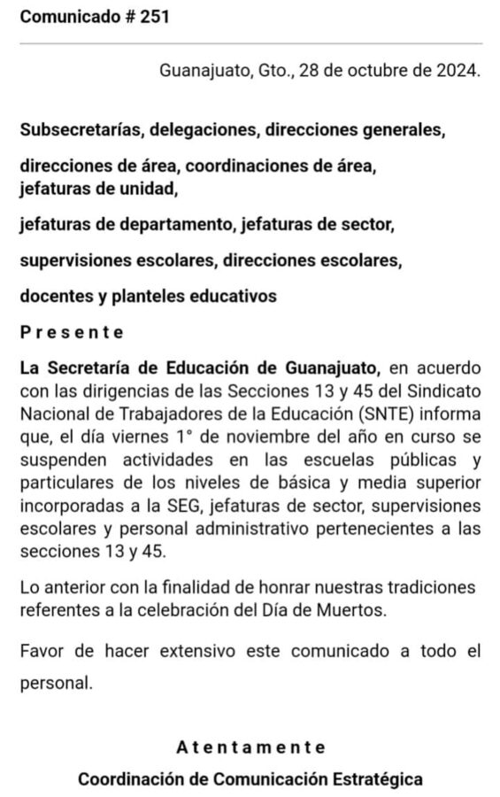 “El día viernes 1 primero de noviembre se suspenderán actividades en las escuelas públicas y particulares de los niveles de básica, media superior incorporadas a la SEG”, así lo informan las autoridades educativas en un comunicado.