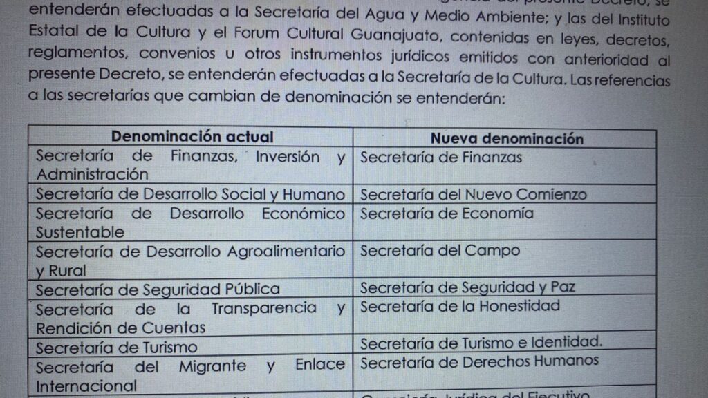 Destaca el cambio de nombres por Secretaría de Finanzas, Secretaría del Nuevo Comienzo, Secretaría del Campo, Secretaría de Seguridad y Paz, Secretaría de la Honestidad y Secretaría de Turismo e Identidad.