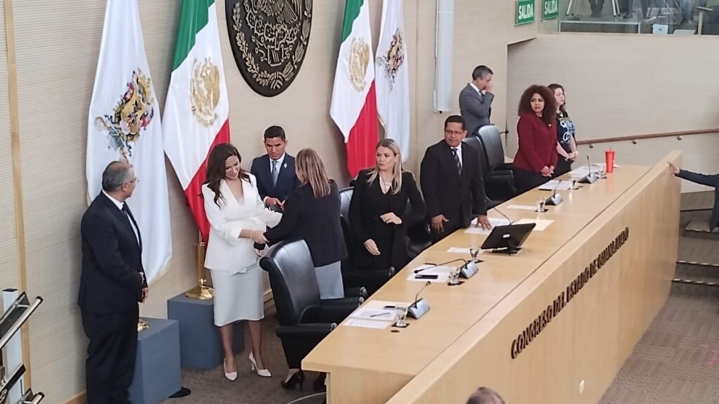 La toma de protesta de la nueva gobernadora no estuvo exenta de enfrentamientos. Además de la lona y cartulinas que portaron los legisladores de Morena, hubo otra que se colocó en la parte izquierda frontal a donde se encontraba Libia Dennise, la gobernadora.