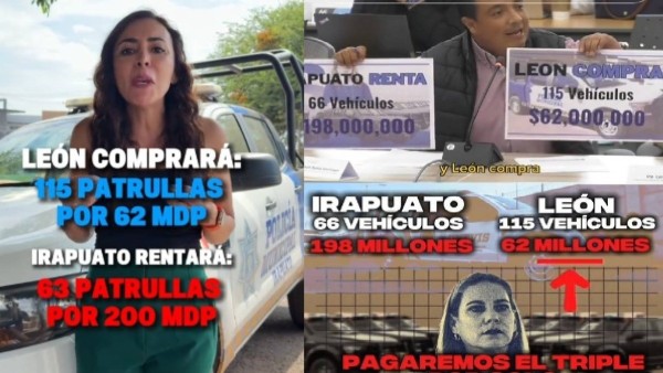 “Y lo más absurdo: en León comprarán 115 patrullas por 65 millones de pesos y aquí en Irapuato rentarán 63 patrullas por 200 millones de pesos, patrullas que ni siquiera serán nuestras”, expresó Yulma en sus redes sociales.