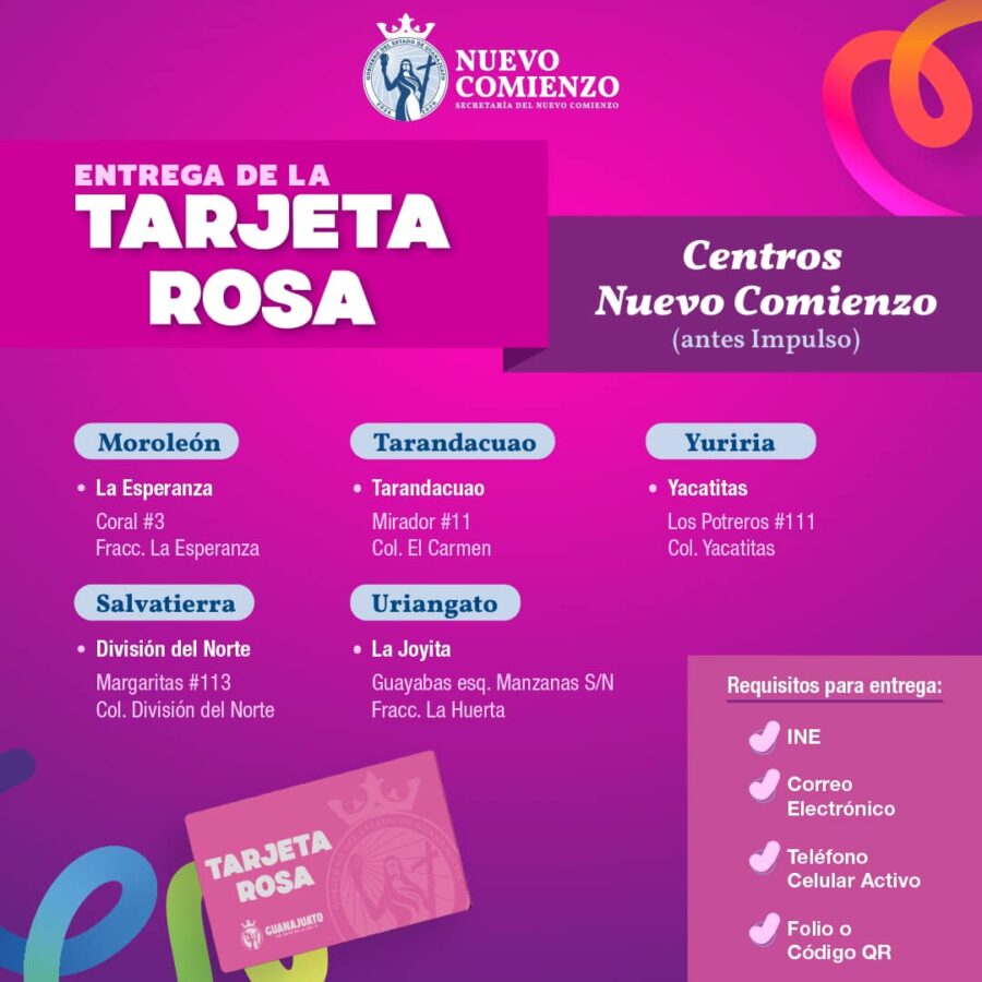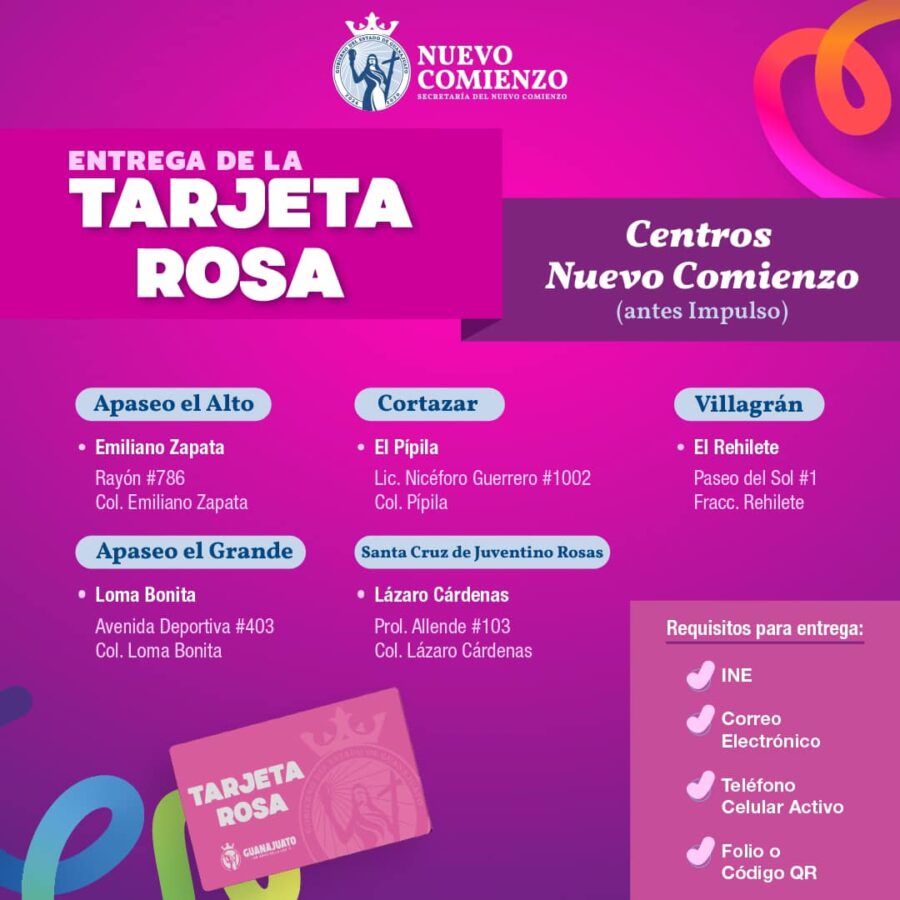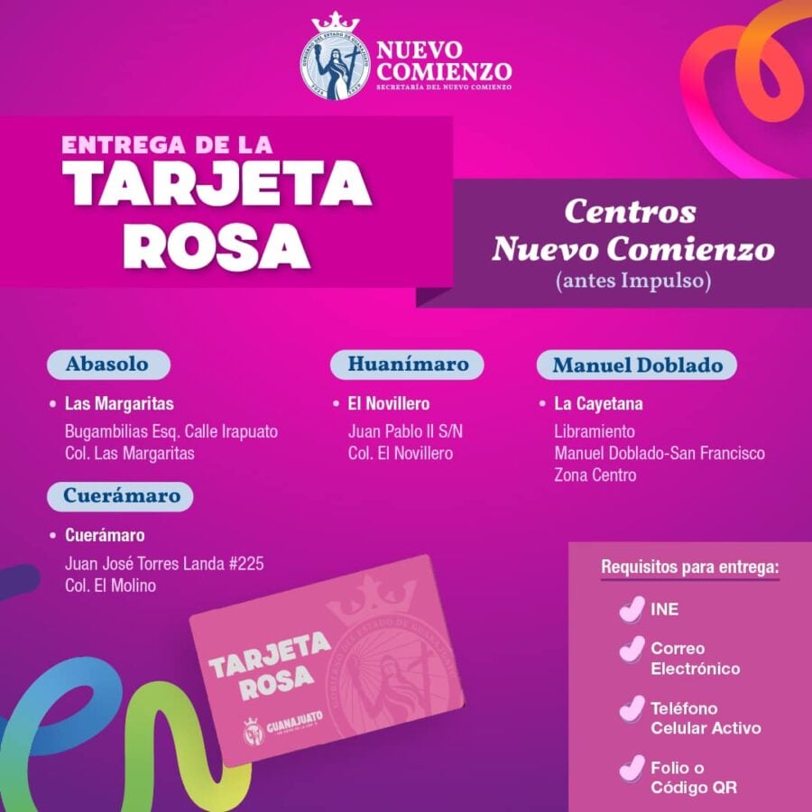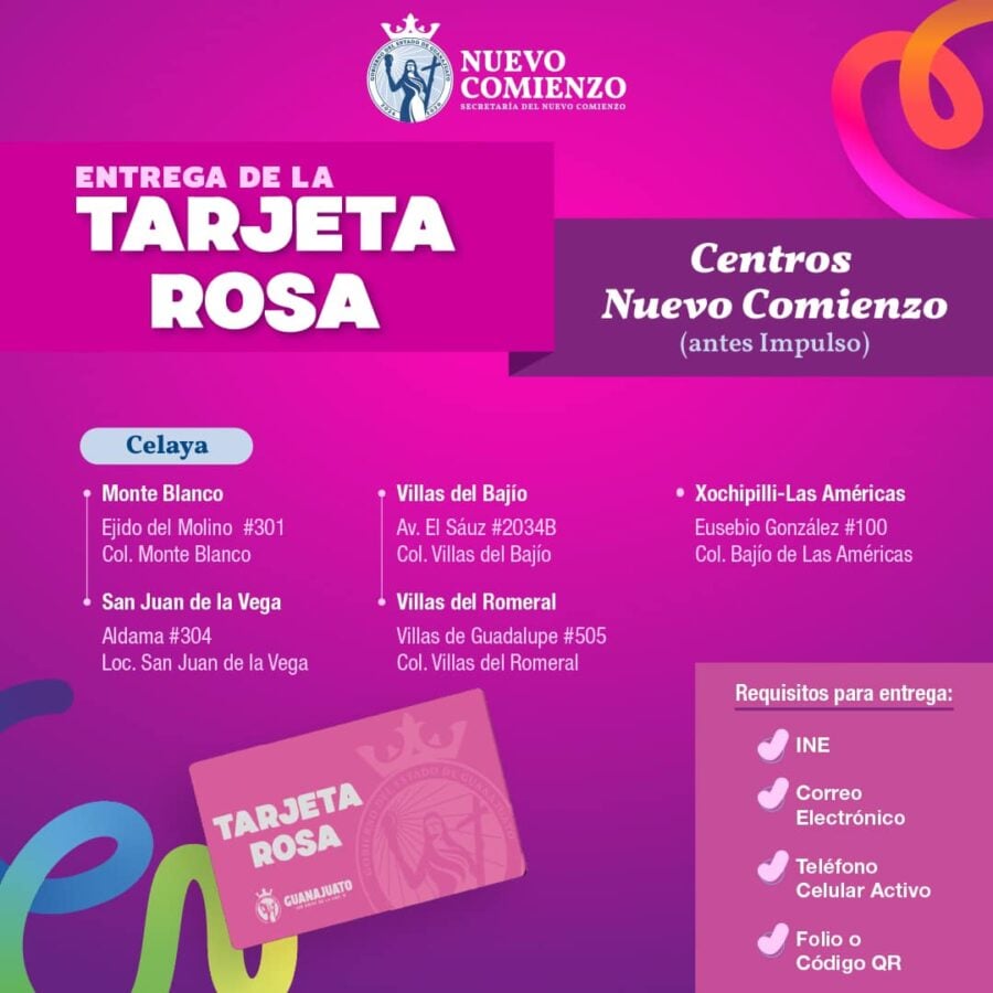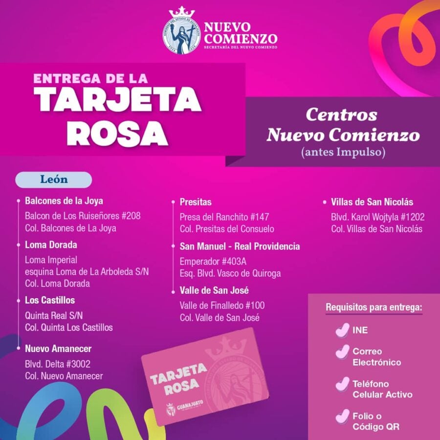 León, Guanajuato - Tras arrancar con la entrega de una nueva tanda de la Tarjeta Rosa en Guanajuato capital, la Secretaría del Nuevo Comienzo dio a conocer los lugares específicos donde se podrá solicitar este apoyo enfocado a las mujeres del estado.