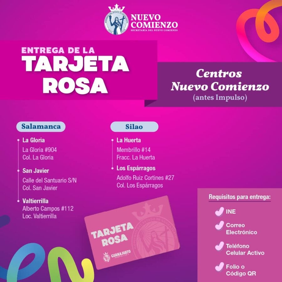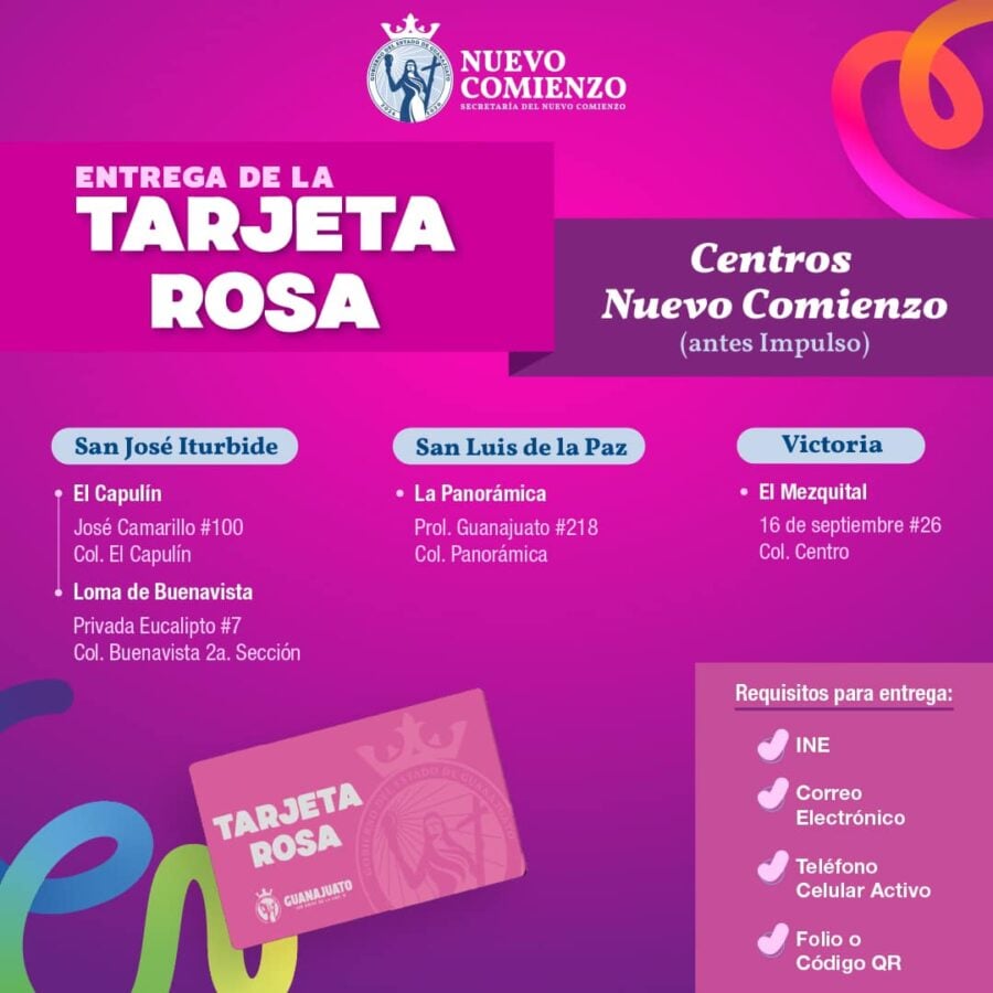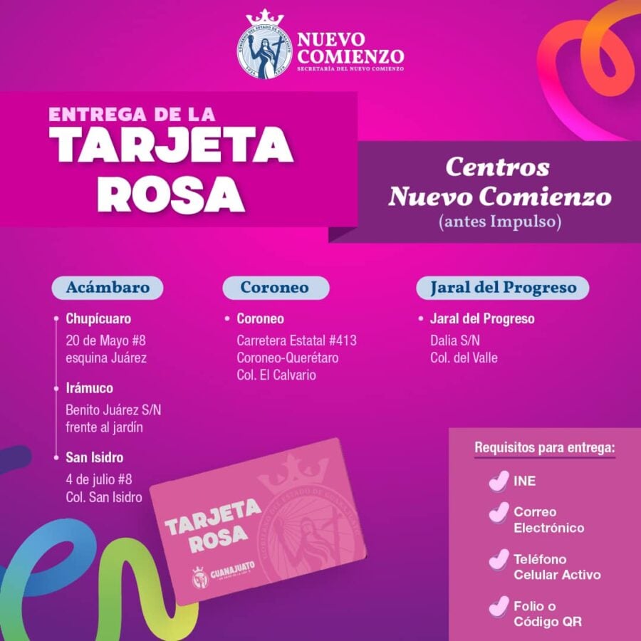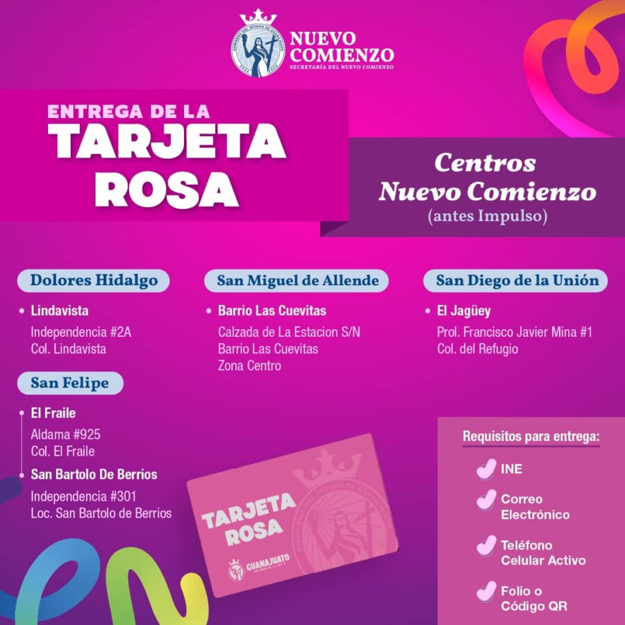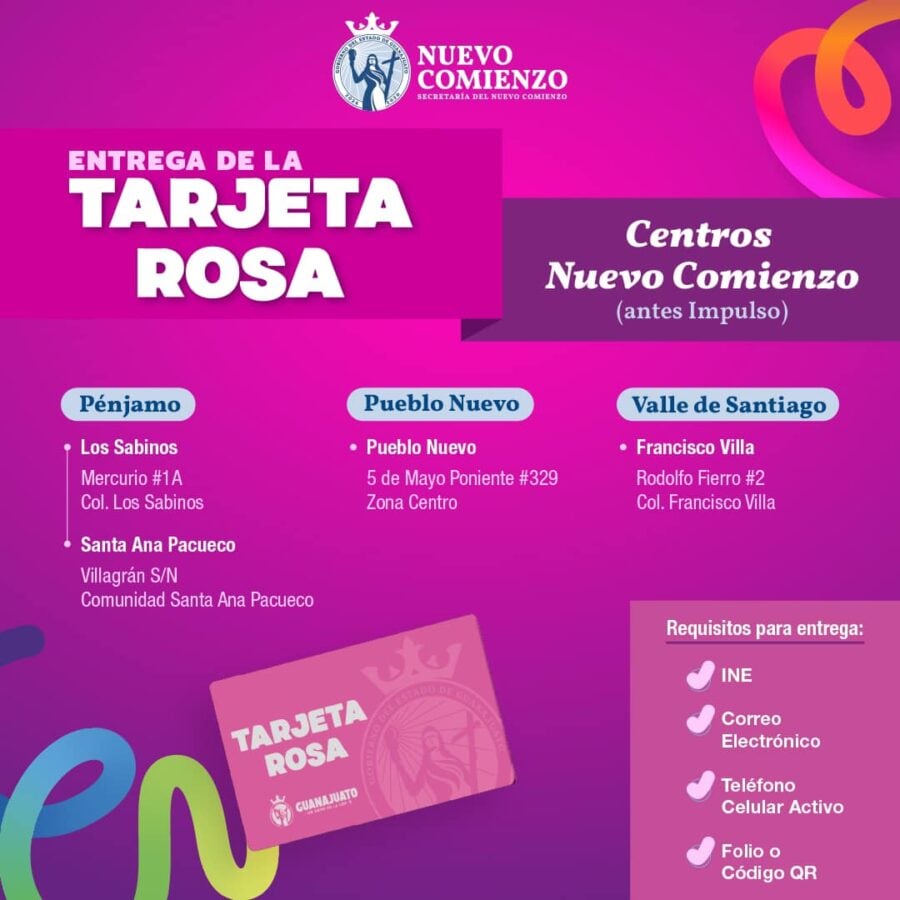 León, Guanajuato - Tras arrancar con la entrega de una nueva tanda de la Tarjeta Rosa en Guanajuato capital, la Secretaría del Nuevo Comienzo dio a conocer los lugares específicos donde se podrá solicitar este apoyo enfocado a las mujeres del estado.