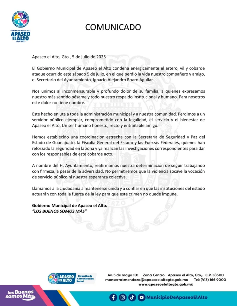 A través de un comunicado, el Gobierno estatal, a través de la Secretaría de Seguridad y Paz condenó el homicidio del secretario del Ayuntamiento de Apaseo el Alto, y expresó su total solidaridad con su familia y con el Gobierno municipal.