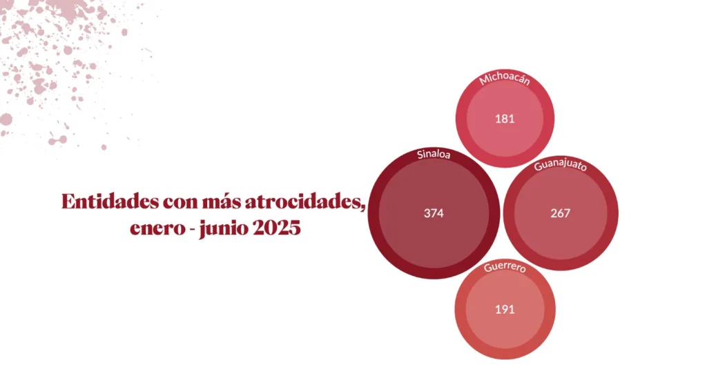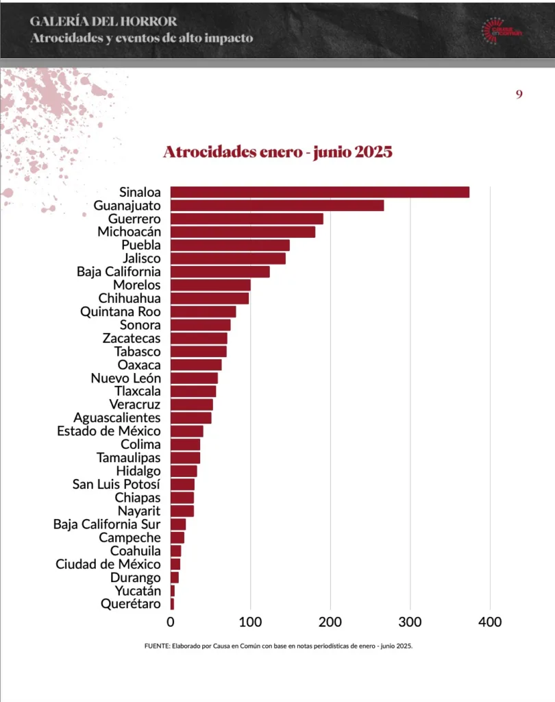 En un análisis hemerográfico de más de 2 mil 139 notas periodísticas catalogadas como atrocidades de enero a junio del 2025, Guanajuato se ubicó en la segunda posición a nivel nacional con 267 atrocidades y 379 víctimas. Sinaloa que está en primera posición con 379 atrocidades y 428 víctimas.