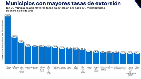 La entidad encabeza la tasa de víctimas por extorsión en el país, con un 24.1% por cada 100 mil habitantes