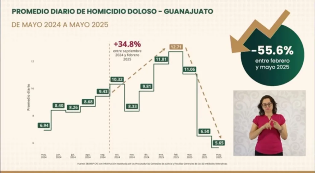 “Desde marzo empezó a registrarse una tendencia descendente, esto debido a operativos y detenciones de generadores de violencia (…) durante el mes de mayo Guanajuato registró un promedio de 5.65 homicidios diarios, es decir, se tuvo una reducción de 55.6 %, entre febrero que fue incluso el pico más alto de la serie, que llegó a 12.7 homicidios diarios, y mayo que registra el periodo más bajo de esta serie analizada”, sostuvo la funcionaria federal.