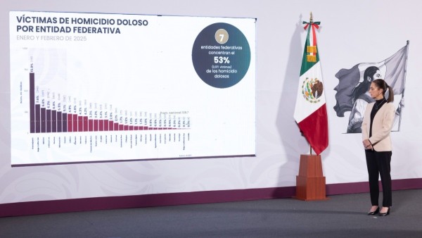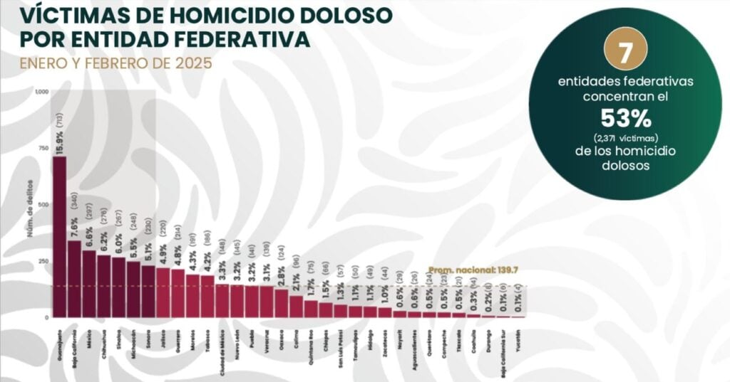 A nivel nacional, de enero de 2024 a febrero de 2025, se ha registrado una disminución del 15% en los homicidios dolosos.