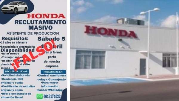 "Hacemos un llamado a hacer caso omiso de este y de cualquier otro anuncio con esta dinámica de reclutamiento. Siempre que Honda de México realiza un proceso de reclutamiento, es completamente transparente, directo en sus instalaciones y con personal identificado en todo momento", señala en su comunicado.