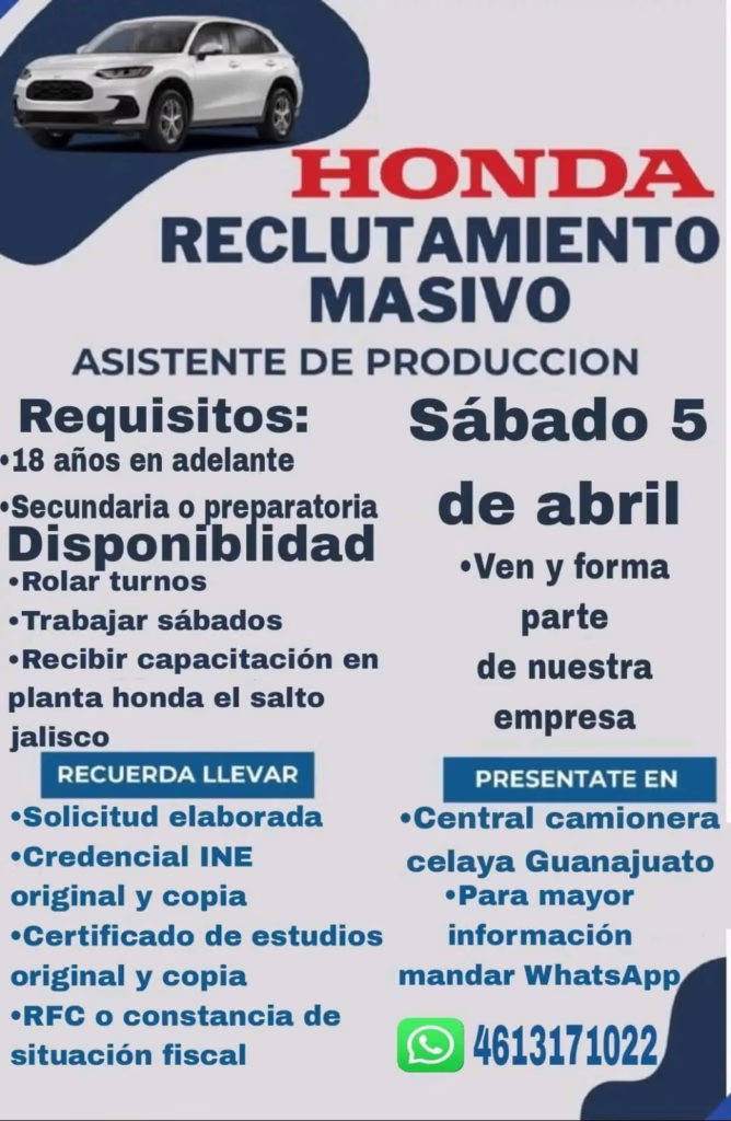 Celaya, Guanajuato - Luego de que en redes sociales circulara un anuncio, aparentemente de la empresa del sector automotriz Honda en Celaya, donde se informa sobre un presunto reclutamiento masivo de asistentes de producción, la empresa Honda de México alertó que el anuncio es falso y que todos sus procesos de contratación se realizan directamente en sus instalaciones.