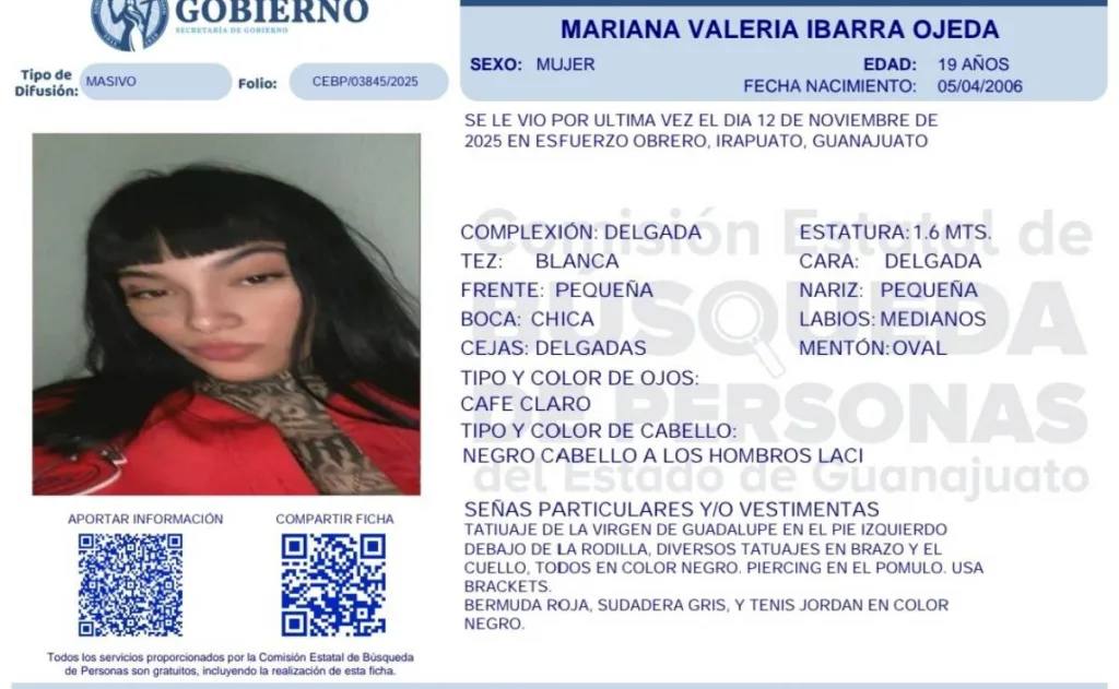 Guanajuato - La mañana de este viernes, la página Protocolo Alba reportó que ya se localizó a Mariana Valeria Ibarra, una joven de 19 años, buscadora e hija de una integrante del colectivo Hasta Encontrarte, quien había sido reportada como desaparecida en Irapuato.