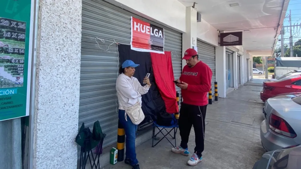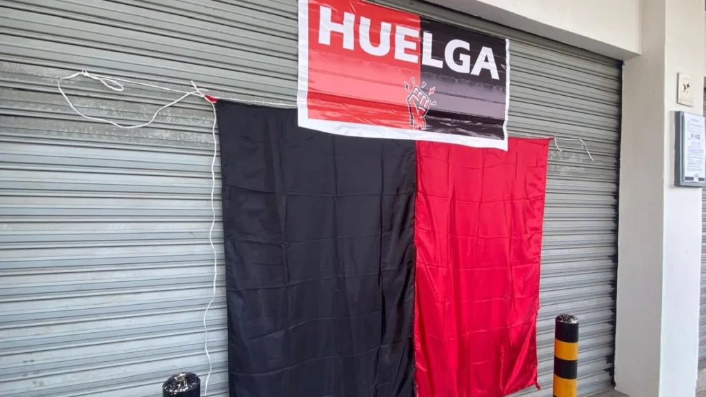 A partir de los primeros minutos de este miércoles, en las puertas de cada una de las cinco sucursales del Nacional Monte de Piedad en León, fueron colocadas banderas rojinegras y una manta con la palabra Huelga.