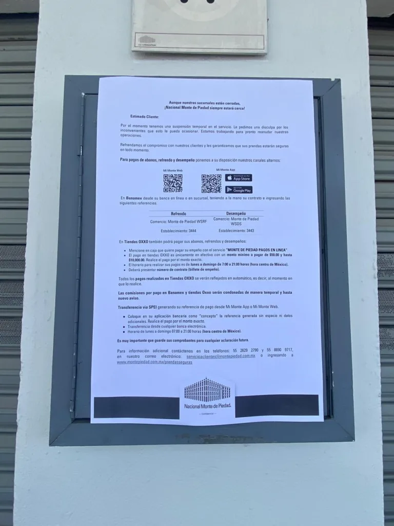 En cada una de las sucursales, los directivos de la institución colocaron para los clientes un aviso, en el que se informa que los pagos de abonos, refrendo y desempeño, se pueden realizar a través de las aplicaciones “Mi Monte App”.