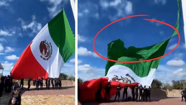 De pronto, en un video que circula en redes sociales se ve cómo un fuerte viento genera un tipo de bolsa muy tensa, lo cual provoca que la bandera se rasgue en la franja verde, desplomándose desde varios metros.