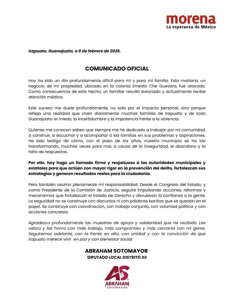 Guanajuato, Guanajuato - El diputado local de Morena por el Distrito XII en Irapuato, Abraham Ramos Sotomayor, denunció un ataque con arma de fuego en contra de un negocio de su propiedad en el que se encontraba un familiar y quien resultó lesionado.