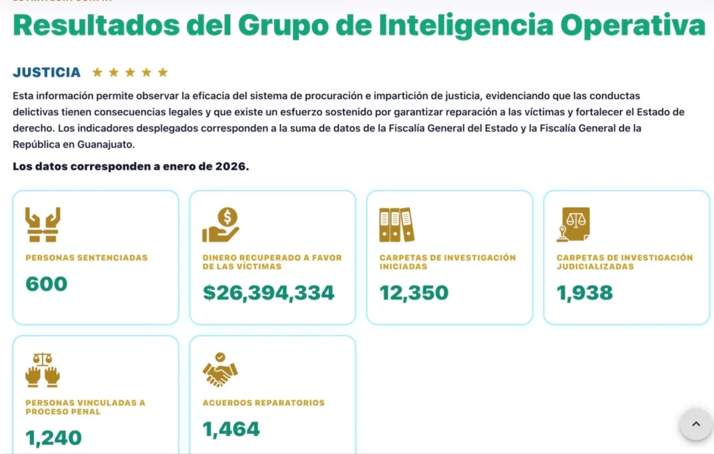 Guanajuato - El Grupo de Inteligencia Operativo, integrado por instituciones estatales y federales de seguridad en la entidad, difundirá los resultados de sus operativos y acciones en la plataforma digital “Guanajuato en Paz”.