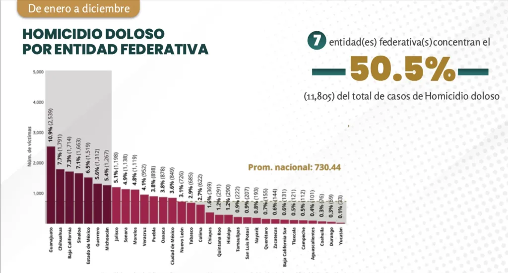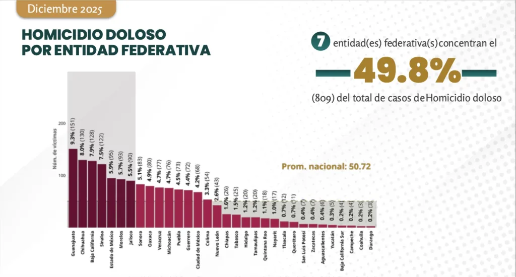 En diciembre del año pasado también siete entidades concentraron el 50 por ciento de los homicidios dolosos y Guanajuato también participa.