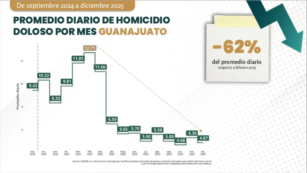 “Es una disminución del 62 por ciento en el promedio diario de homicidios después de que Guanajuato llegara a registrar hasta 12.7 homicidios diarios, mientras que en el mes que acaba de concluir, en diciembre, se registraron 4.87 homicidios diarios promedio”.
