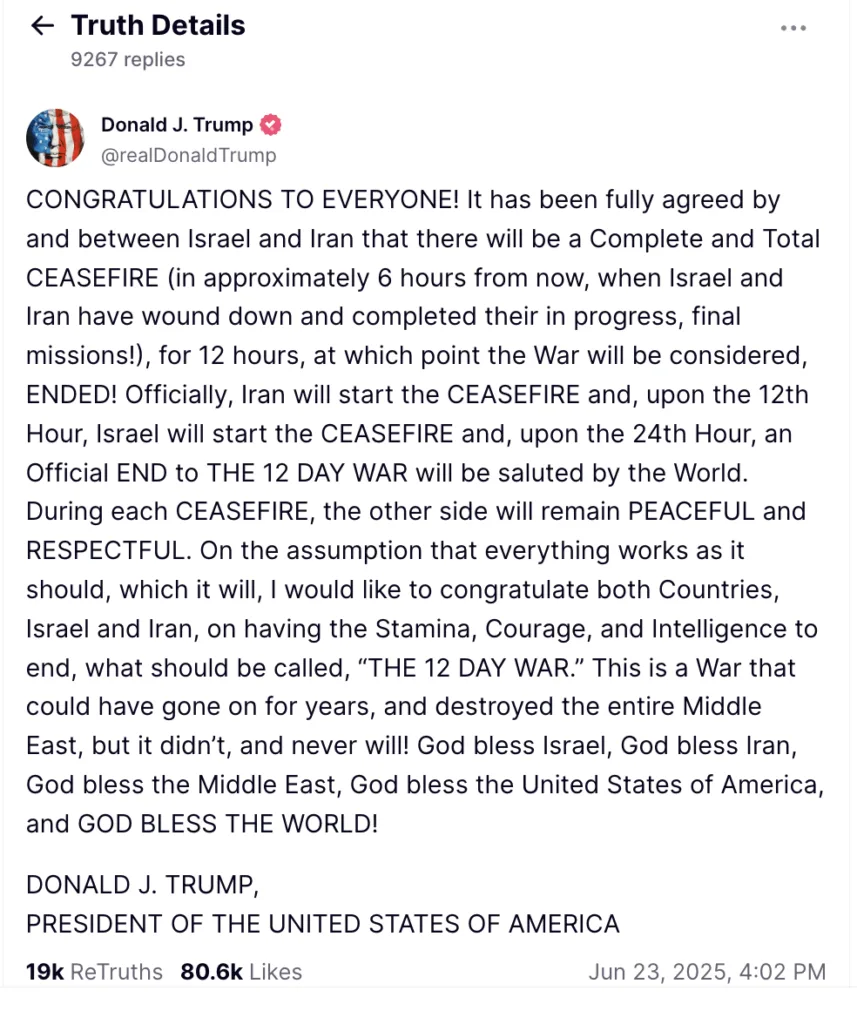 Oficialmente, Irán iniciará el ALTO AL FUEGO y, a las 12 horas, Israel iniciará el ALTO AL FUEGO y, a las 24 horas, el mundo celebrará oficialmente el FIN DE LA GUERRA DE LOS 12 DÍAS. Durante cada ALTO AL FUEGO, la otra parte se mantendrá PACÍFICA y RESPETUOSA", escribió Trump.