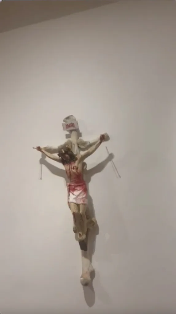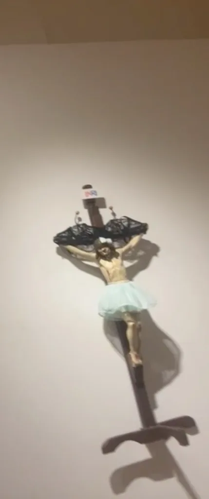 La exhibición estaba conformada por figuras de Cristo con un tutú de ballet, un moño en la cabeza y lo que parece ser un brasiere en la cruz con cadenas en cada una de las manos a manera de esclavo; con un faldón en color negro y un tatuaje o figura en el pecho de la estrella de David; con sangre y con toallas femeninas en la parte superior de la cruz de madera.