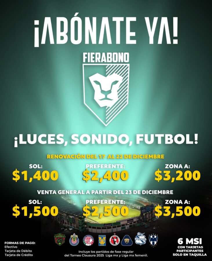 -$1,400 Sol-$2,400 Preferente -$3,200 Zona ASe puede realizar en las taquillas del estadio o a través del sistema de Boleto móvil.La venta general comenzará, hasta agotar existencias, el lunes 23 de diciembre con precios de:-$1,500 Sol-$2,500 Preferente -$3,500 Zona A Juárez, Chivas, Toluca, Tigres, Tijuana, Pumas, Puebla y Monterrey, serán los rivales que visiten la casa de la Fiera a partir del 25 de enero próximo, cuando se abran las actividades recibiendo a los fronterizos.Cabe decir que el abono no influye los partidos de una posible Liguilla del equipo varonil, aunque sí da acceso a todos los encuentros del conjunto femenil y se promoción de seis meses sin intereses, aunque la afición primordialmente está esperando el anuncio de nuevos fichajes.Lee también: ‘Me acompañaron mucho’: Adonis Frías agradece renovación al Club León
