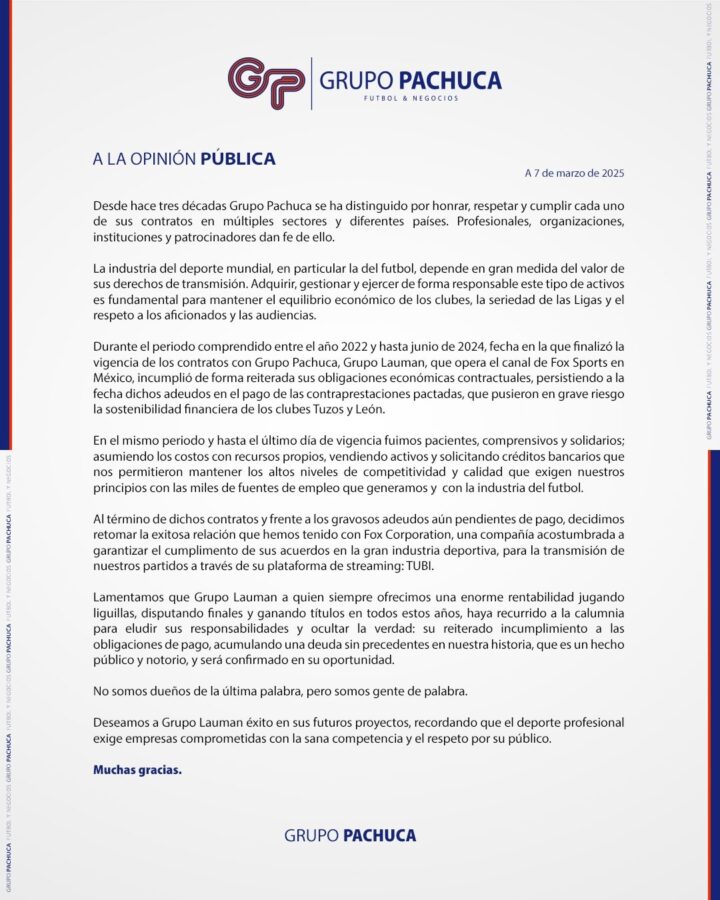 En un comunicado publicado este viernes, Grupo Pachuca fue tajante al señalar a Fox Sports MX por acumular “una deuda sin precedentes en nuestra historia, que es un hecho público y notorio, y será confirmado en su oportunidad”, incluso lamentando que Grupo Lauman “haya recurrido a la calumnia para evadir sus responsabilidades”.