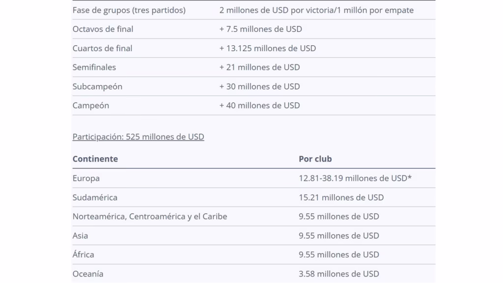 Si un club gana un partido del Mundial, se embolsará también 2 millones de dólares, mientras que un empate generaría 1 millón de dólares.