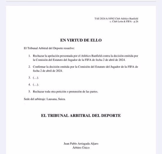 Tras litigios y apelaciones, Banfield acudió al TAS, pero su apelación fue rechazada por el organismo judicial, que falló a favor de la Fiera. Ahora, el club recibirá obligatoriamente los 165 mil dólares adeudados, a la espera de conocer si se sumará algo más por daños y perjuicios.