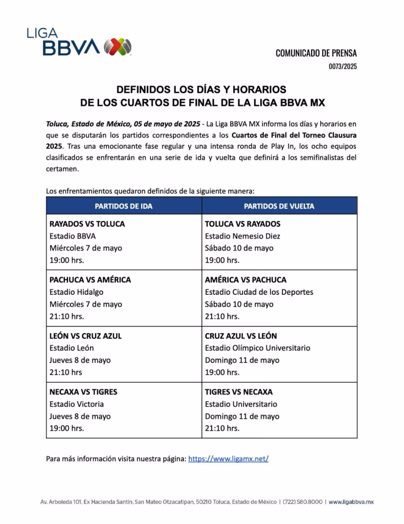 Por otra parte, el miércoles se pondrán en marcha las llaves de: Toluca vs Monterrey y América vs Pachuca, mientras que jueves y domingo también chocarán Tigres y Necaxa.