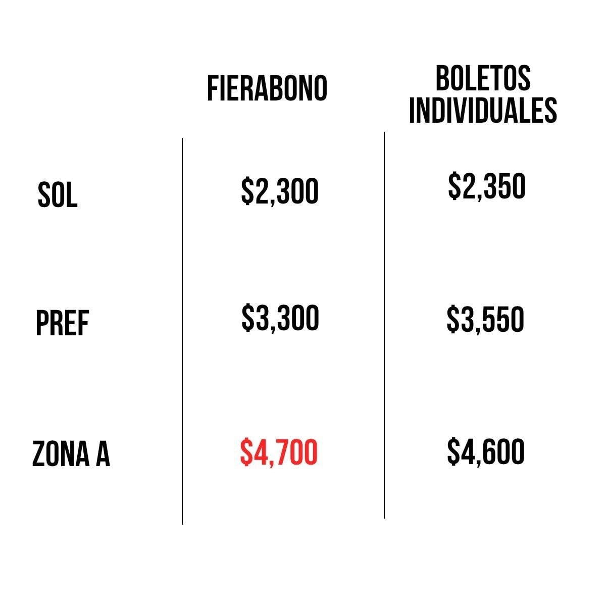 En zonas como Sol y Preferente, el ahorro existe, pero es reducido. Por ejemplo, el Fierabono en Sol costó $2,300, mientras que comprar todos los boletos por separado rondó los $2,350. En Preferente, la diferencia fue de apenas $250 pesos.