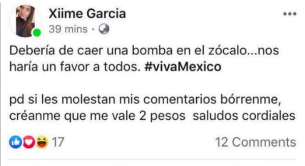 Debería de caer una bomba en el Zócalo… Nos haría un favor a todos. #VivaMéxico. pd si les molestan mis comentarios bórrenme, créanme que me vale 2 pesos. Saludos cordiales”, posteó en Facebook.Interjet de inmediato se deslindó de las declaraciones de su empleada, y dijo que estas no representan la visión o valores de la empresa. Manifestó además que rechaza enérgicamente cualquier manifestación de violencia y refrendó que la aerolínea es tolerante. Cientos de usuarios de redes sociales rechazaron también las declaraciones y dijeron que no volarían más con la aerolínea, además la llamaron #LadyBomba. El 8 de marzo pasado, Interjet compartió en sus redes sociales una fotografía de Xime García, a quien presentó como la segunda al mando de la aeronave. *R