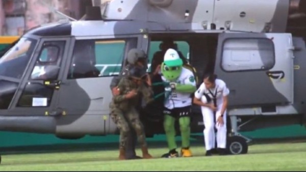 Tras el aterrizaje, la botarga de tortuga, custodiada por un elemento con ropa de camuflaje y otra mujer de la Semar, le entregó la primera bola al Gobernador morenista, Carlos Merino, según lo observado en videos del partido.