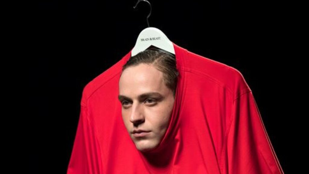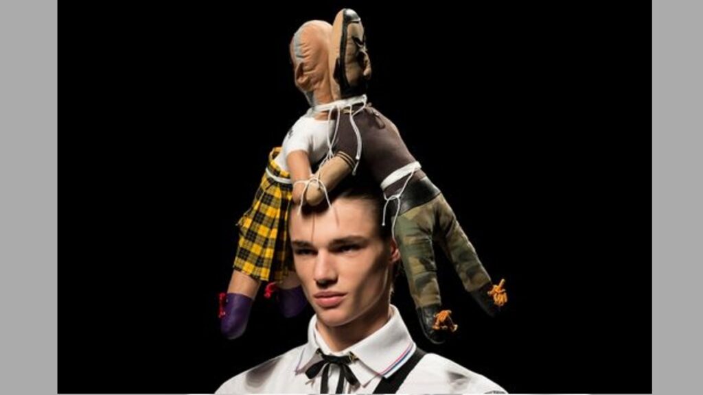 Dos muñecos sobre la cabeza del modelo en la pasada de Brain & Beast en Madrid Fashion Week, una de las más innovadoras y vanguardistas de la semanas de la moda internacional.