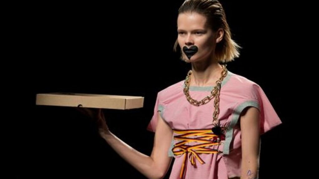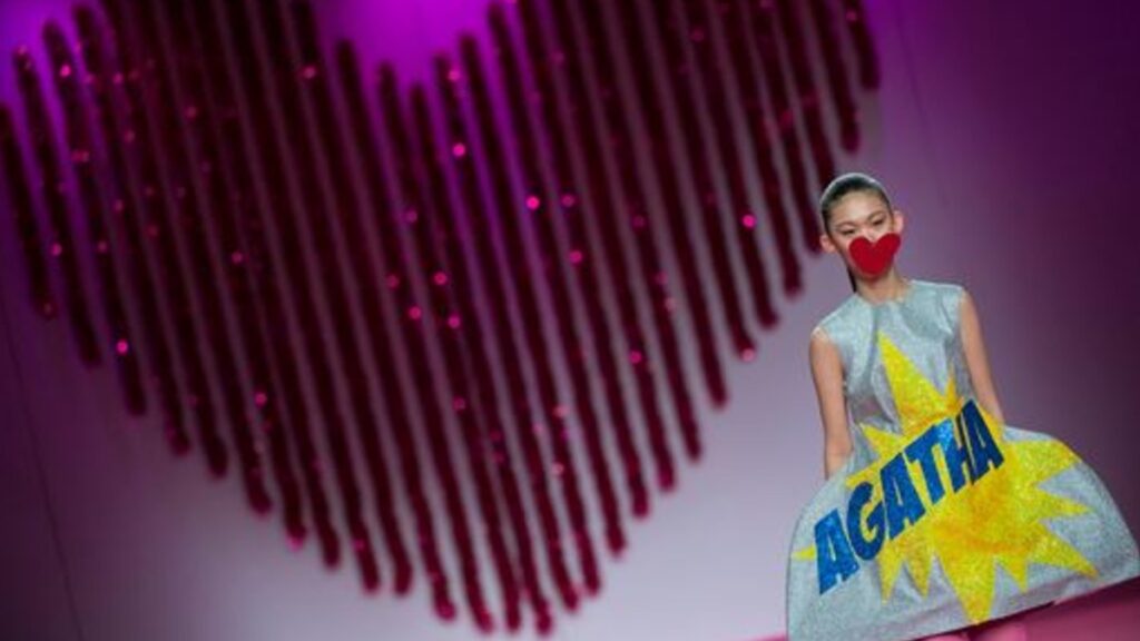 Un particular diseño de Ágatha Ruiz de la Prada: dos esferas metalizadas de glitter rayadas con mega plataformas. El estilismo del desfile consistía en tapar la boca de las modelos con corazones de cartón en rojo.