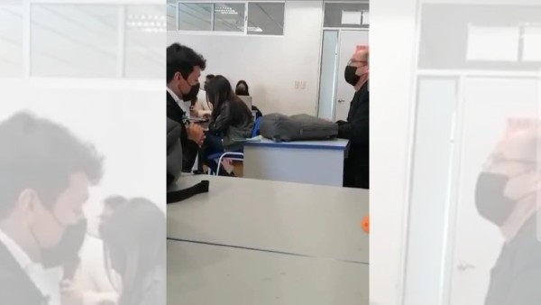 En el video tomado por alguno de sus compañeros, se ve cómo el estudiante de la licenciatura en Ciencias de la Educación, se tapa la cara por pena.