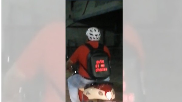 El video que fue compartido en redes sociales, se puede ver al conductor con una playera roja, casco para bicicleta y la mochila negra con pantalla led que va cambiando de mensaje.