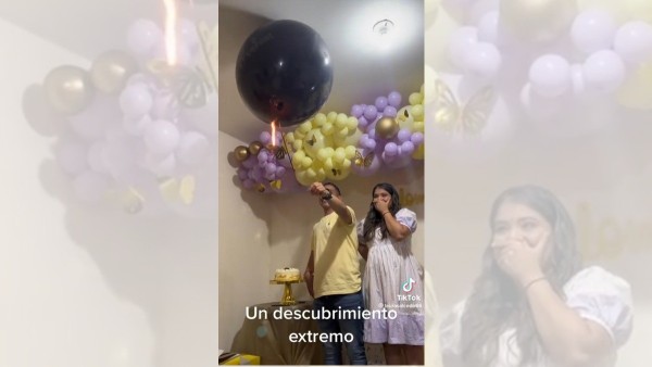 A través de un video, se ve cómo el futuro papá calienta un globo negro, lleno de helio, para que este explotara y así saber si será niña o niños.