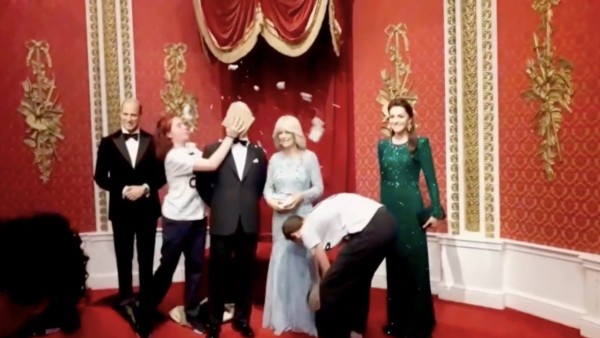 El grupo activista, que recientemente se ha caracterizado por lanzar consignas y ha atentado contra algunas obras de arte, en esta ocasión dieron tremendo pastelazo a la figura de cera del rey Carlos III que se encuentra dentro del museo Madame Tussauds.